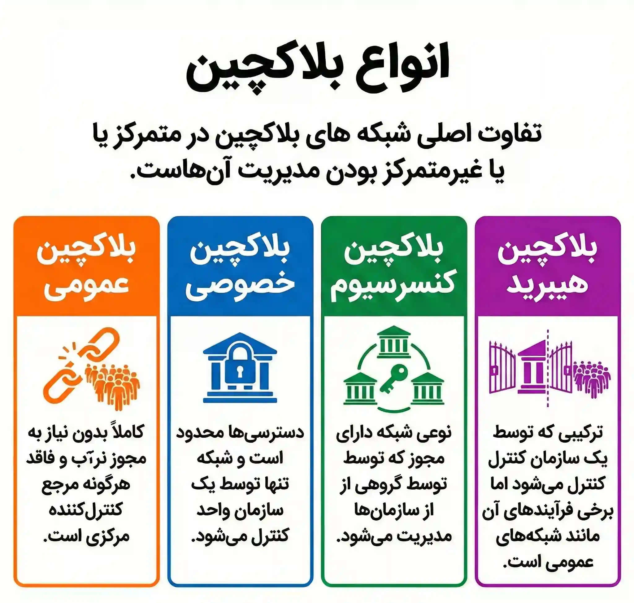 تا به اینجای مقاله توانستهایم به یک درک نسبی درباره بلاک چین چیست دست پیدا کنیم. در ادامه توضیح خواهیم داد که blockchain به طور کلی به چند دسته تقسیم میشود. بلاکچینها بهطور کلی به دو دسته بلاکچینهای بدون نیاز به مجوز (Permissionless) و بلاکچینهای بامجوز (Permissioned) تقسیم میشوند. بلاکچین عمومی (Public Blockchain) در دسته بلاکجینهای بدون نیاز به مجوز و بلاکچینهای خصوصی (Private Blockchain) و بلاکچین های کنسرسیومی (Consortium Blockchain) در گروه بلاکچینهای بامجوز قرار میگیرند. یک نوع از بلاکچین نیز با نام بلاکچین هیبریدی (Hybrid Blockchain) وجود دارد که برخی از ویژگیهای بلاکچین بدونمجوز و برخی از ویژگیهای بلاکچین بامجوز را دارد.