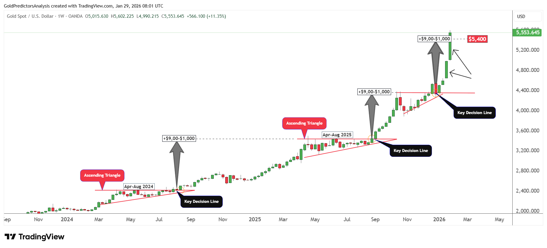 شکست ساختاری طلا از سطح ۴,۴۰۰ دلار نشان‌دهنده حرکتی قدرتمند به سمت ۵,۴۰۰ دلار است. نمودار هفتگی نشان می‌دهد که از سال ۲۰۲۴ یک الگوی مثلث صعودی مشابه شکل گرفته بود. هر شکست در این الگو حدود ۱,۰۰۰ دلار افزایش قیمت در بازار طلا ایجاد کرده است.