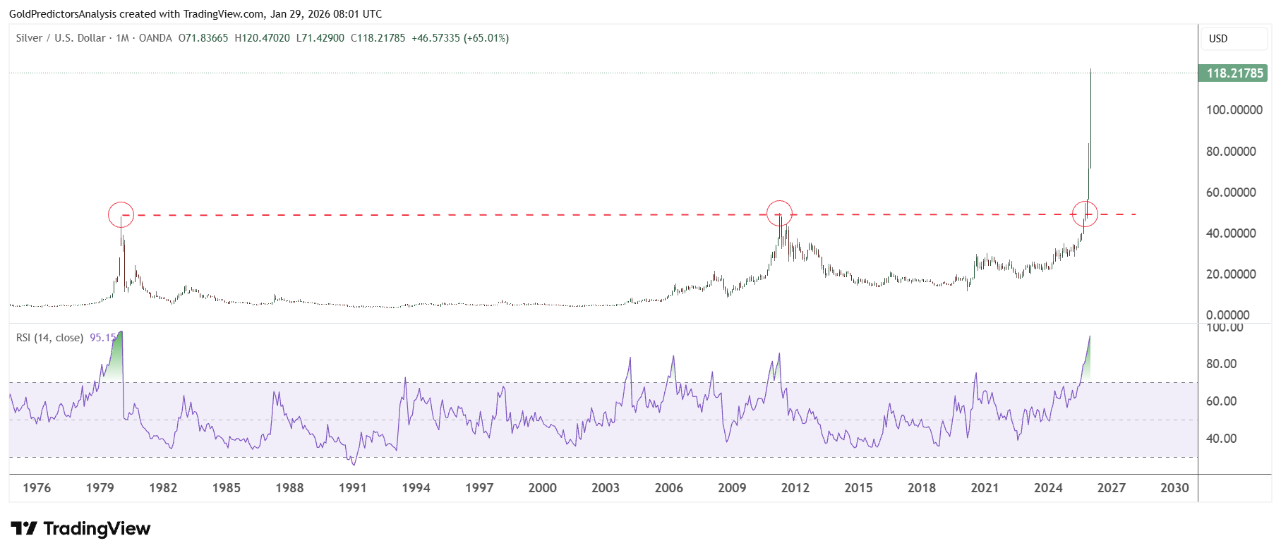 با وجود رشد قوی طلا، بازار نقره نیز وضعیت هشداردهنده‌ای به‌ویژه پس از شکست سطح ۵۰ دلار نشان می‌دهد. این سطح سقف تاریخی سال‌های ۱۹۸۰ و ۲۰۱۱ بود. شکست این ناحیه باعث یک رالی عظیم در بازار نقره شد که قیمت را به بالای ۱۰۰ دلار رساند. RSI ماهانه نقره نیز در حال نزدیک شدن به سطوح بحرانی مشابه طلا است که نشان‌دهنده احتمال وقوع یک رویداد انفجاری است.