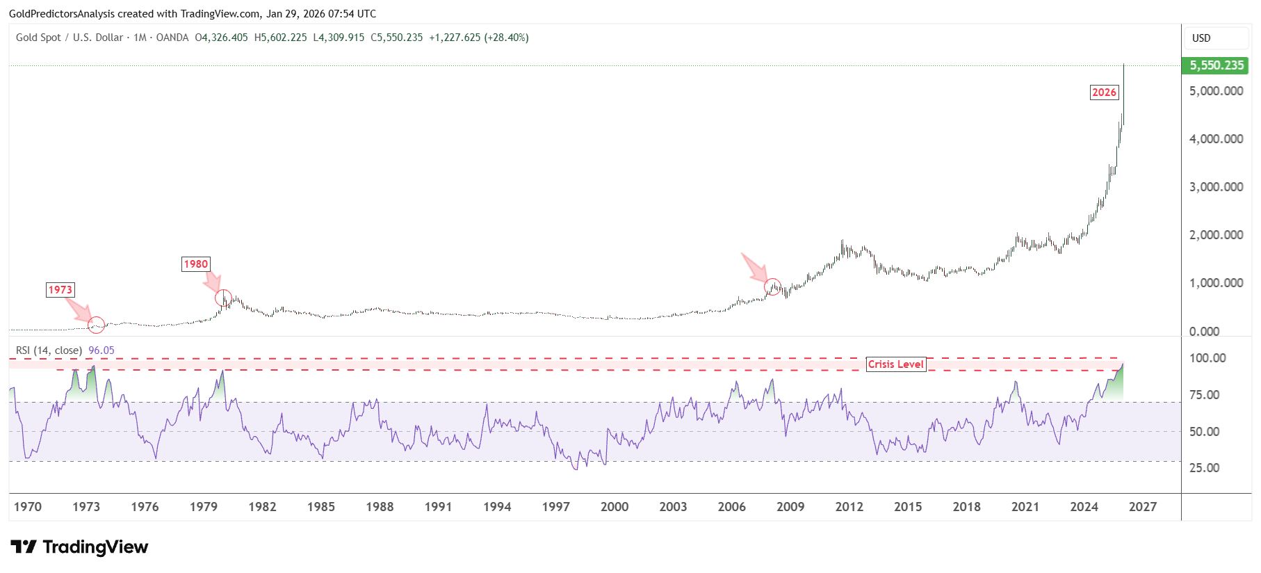 در حال حاضر، RSI ماهانه طلا در سطح ۹۶ و نقره در سطح ۹۵ قرار دارد. این سطوح با شرایط وحشت بازار مرتبط هستند و نشان می‌دهند که پس از تشکیل سقف، احتمال سقوط حدود ۵۰٪ از اوج قیمت وجود دارد.