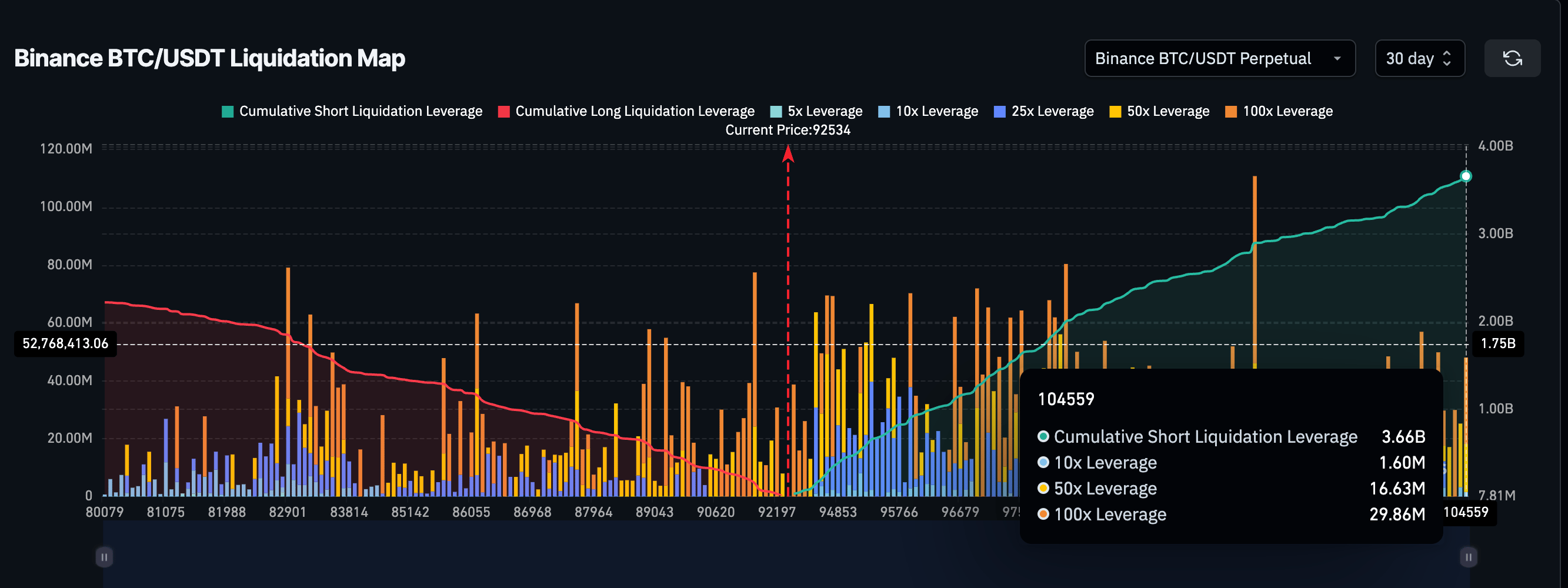 در بایننس، حجم موقعیتهای اهرمی شورت در ۳۰ روز گذشته حدود ۳.۶۶ میلیارد دلار بوده؛ در حالی که حجم لانگها فقط ۲.۲۲ میلیارد دلار است. این اختلاف نزدیک به ۵۰٪، یک فنر فشرده ایجاد کرده که در صورت عبور قیمت از ۹۳٬۷۰۰ دلار میتواند به سرعت آزاد شود. این الگو طی ماه جاری چندین بار تکرار شده است، حرکات کوچک ۱٪ تا ۲٪ بهواسطه لیکوییدیشن شورتها به رالیهای بزرگتر تبدیل شدند.