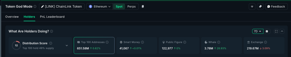 صد آدرس بزرگ نیز ۰.۶۲٪ به داراییهای خود اضافه کردهاند و در همین زمان موجودی صرافیها ۳.۰۹٪ کاهش یافته است. این ترکیب معمولاً نشانهای صعودی است و بیانگر جذب تقاضا توسط نهنگها و هولدرهای خرد است. این رفتار با ساختار نمودار ۱۲ ساعته LINK نیز همراستا است.