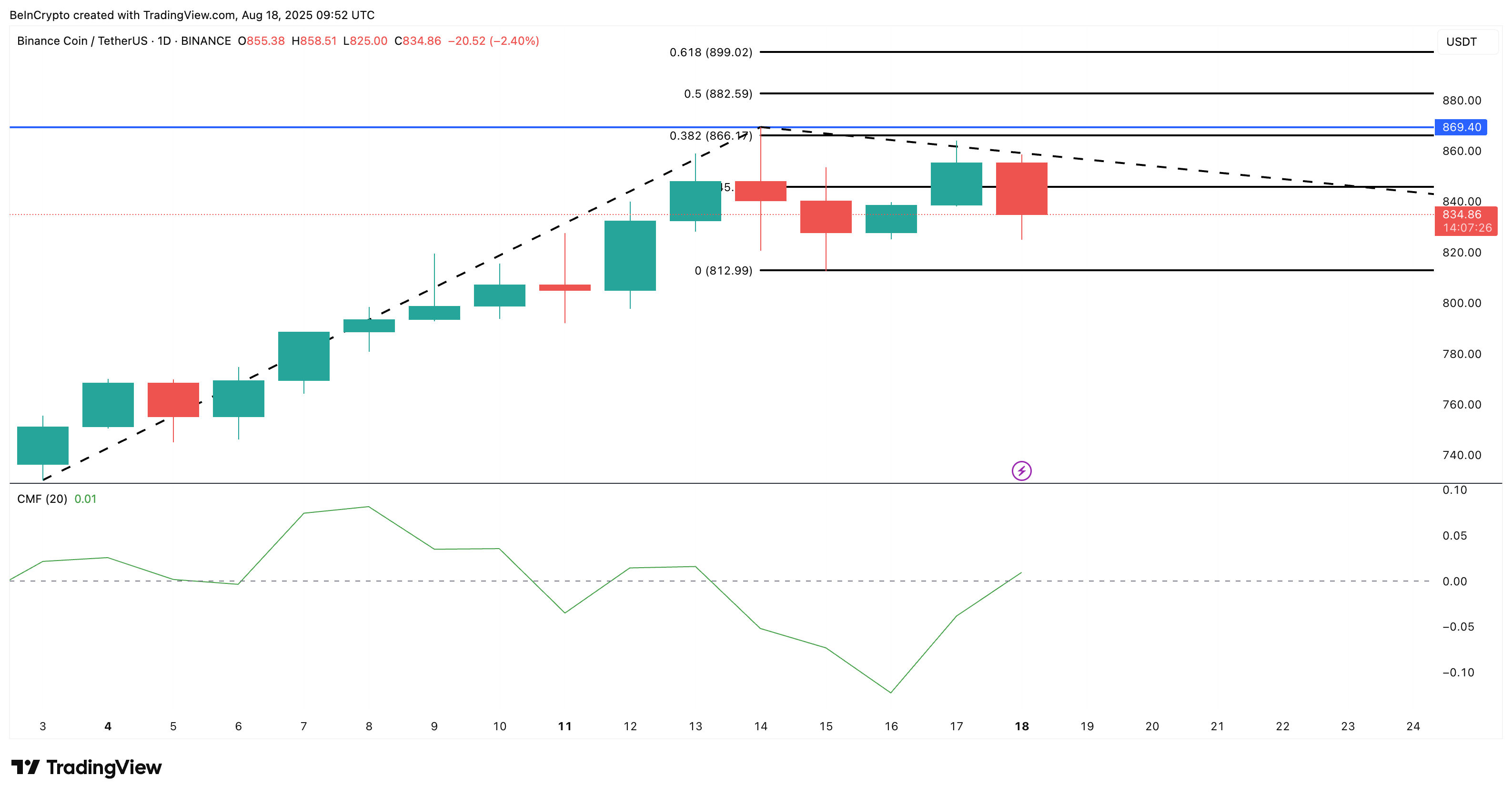 مقاومت اصلی در محدوده ۸۶۶ دلار قرار دارد و عبور از آن میتواند قیمت بایننس کوین را وارد فاز کشف قیمتی کند. هدف بعدی در این مسیر محدوده ۸۸۲ دلار خواهد بود.
