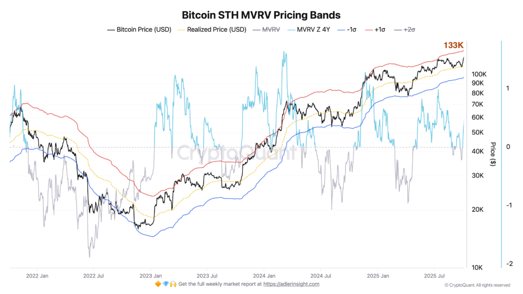 این شرایط بهطور تاریخی با افزایش تمایل به ریسک و رفتار خرید در اصلاحات همراه است. با این حال، نسبت ارزش بازار به ارزش تحققیافته دارندگان کوتاهمدت (MVRV) نیز در حال نزدیک شدن به محدوده ۱ و سطح قیمتی حدود ۱۳۳,۰۰۰ دلار است که میتواند نشاندهنده افزایش فشار فروش ناشی از ذخیره سود باشد. حفظ مومنتوم سود در بالای صدک نودم برای جلوگیری از خستگی روند حیاتی خواهد بود.