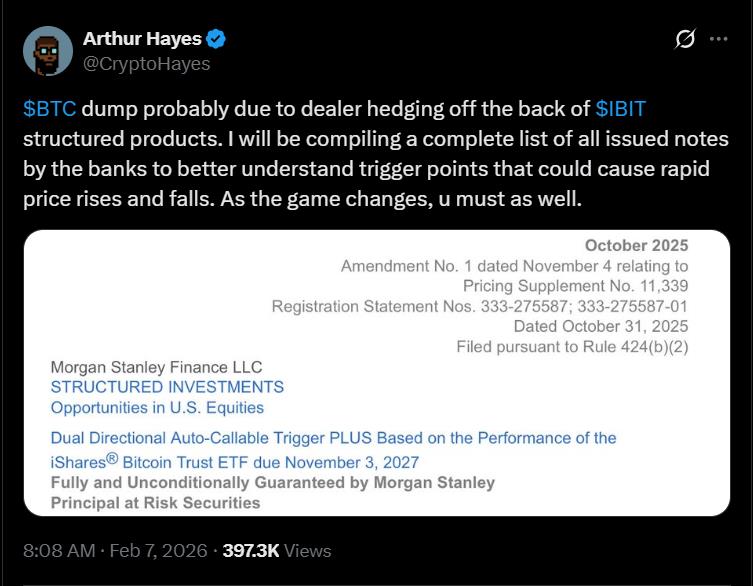 آرتور هیز (Arthur Hayes)، مدیرعامل سابق صرافی بیت مکس، معتقد است بانکهای بزرگی مثل مورگان استنلی (Morgan Stanley) ممکن است عامل این فشار فروش باشند. این بانکها محصولات مالی پیچیدهای به نام اوراق ساختاریافته (Structured Notes) به مشتریان خود میفروشند که به نوعی معامله با اهرم روی قیمت بیت کوین محسوب میشود.