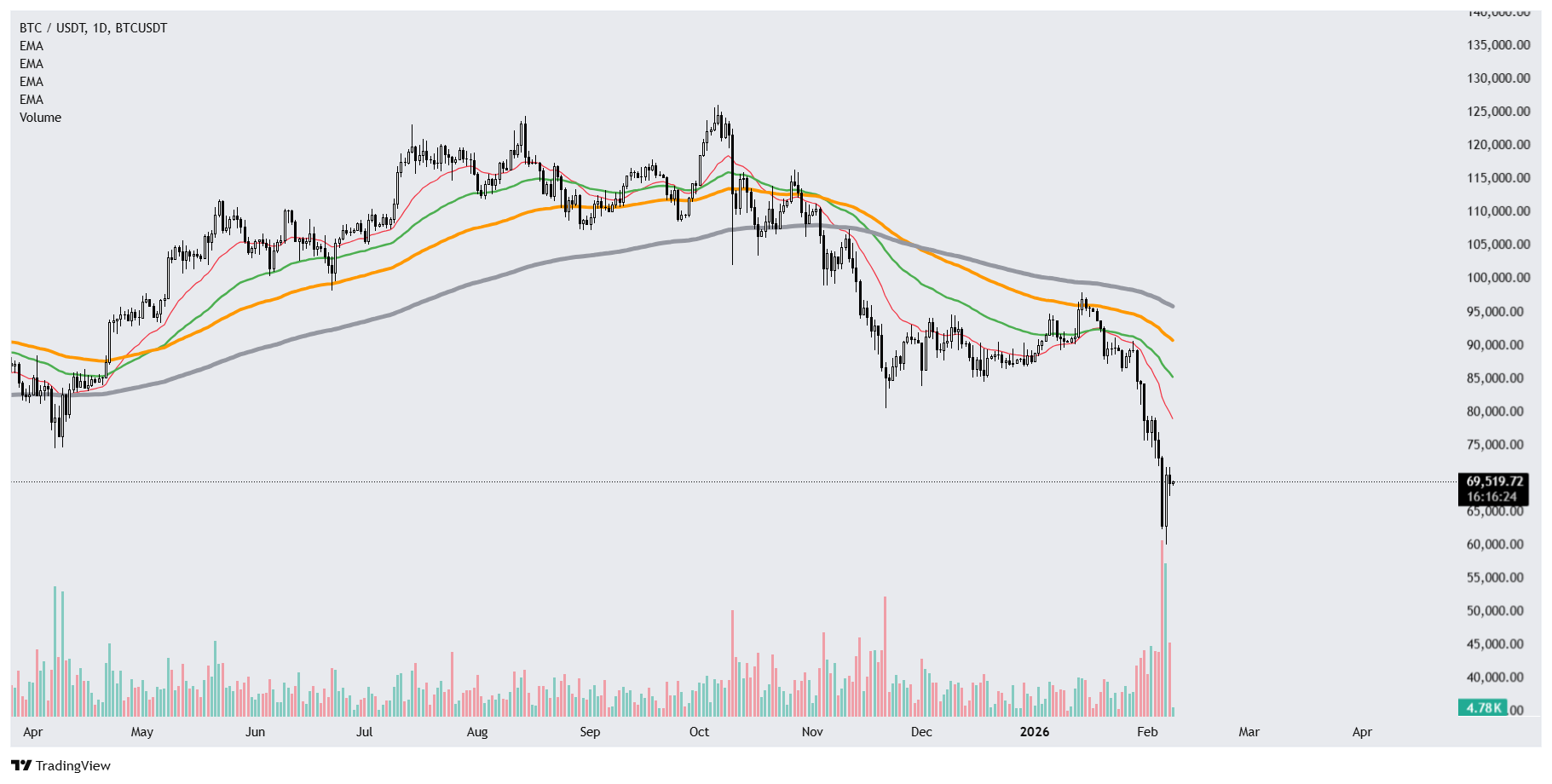 بیت کوین در یک ماه گذشته یکی از بزرگترین موجهای فروش خود را پشت سر گذاشته است. قیمت این دارایی پیشرو در روز جمعه ۷ فوریه ۲۰۲۶ (۱۸ بهمن) با ریزشی بیش از ۴۰ درصد، به پایینترین سطح یک سال اخیر خود یعنی حدود ۵۹,۹۳۰ دلار رسید. در حال حاضر، قیمت بیت کوین نسبت به اوج تاریخی خود در اکتبر ۲۰۲۵ (مهر ۱۴۰۴) که نزدیک به ۱۲۶,۲۰۰ دلار بود، بیش از ۵۰ درصد فاصله گرفته است.