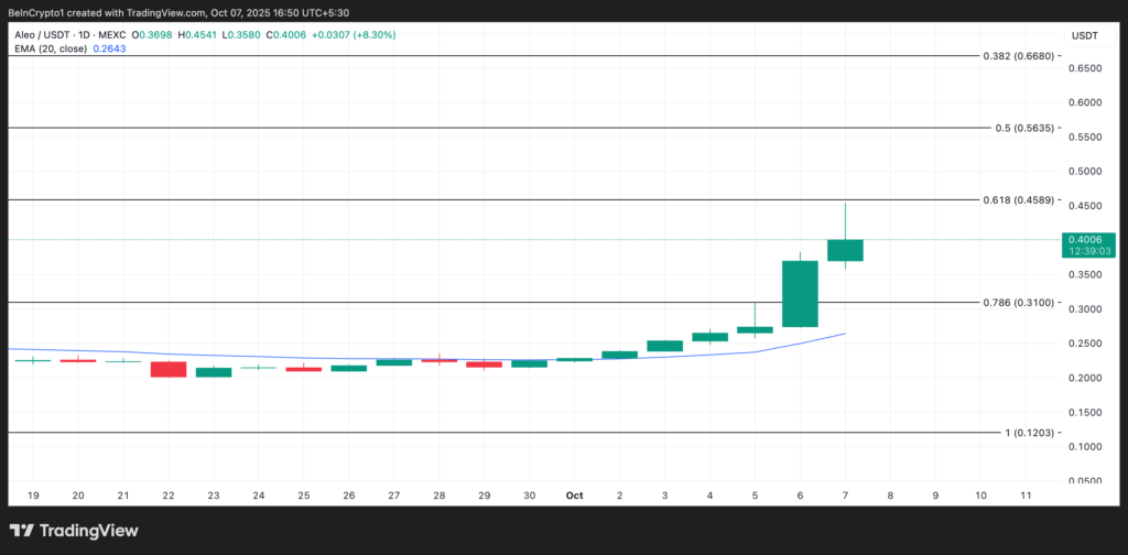 در لحظه نگارش، قیمت الئو حدود ۰.۳۳۹ دلار است و بالاتر از میانگین متحرک نمایی ۲۰روزه خود قرار دارد. این میانگین، قیمت ۲۰ روز اخیر را با تمرکز بر دادههای جدیدتر میسنجد و قرار گرفتن قیمت در بالای آن، نشانهای از قدرت روند صعودی است.