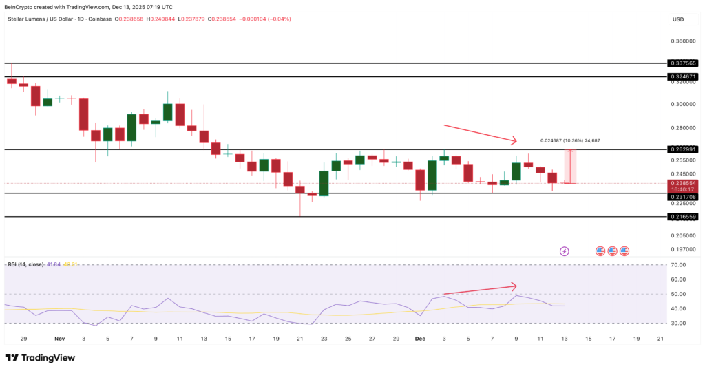 برای شکستن ساختار نزولی، استلار باید سطح ۰,۲۶۲ دلار را پس بگیرد؛ این مقاومت از اواسط نوامبر تاکنون تمامی تلاشهای صعودی را متوقف کرده است. عبور از این سطح به حرکتی حدود ۱۰٪ نیاز دارد و میتواند نشانهای از بازگشت خریداران به دفاع از قیمتهای بالاتر باشد.