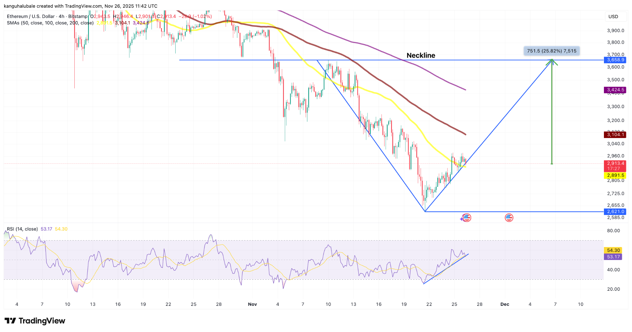 از منظر تکنیکال، اتریوم از اوایل نوامبر وارد الگویی «V شکل» شده است و اگر بتواند مقاومتهای پیش رو را پشت سر بگذارد، این الگو میتواند کامل شود. قیمت ETH اکنون زیر محدوده عرضه ۳,۰۰۰ تا ۳,۵۰۰ دلار در نوسان است؛ جایی که میانگینهای متحرک ۱۰۰ و ۲۰۰ دورهای قرار دارند.