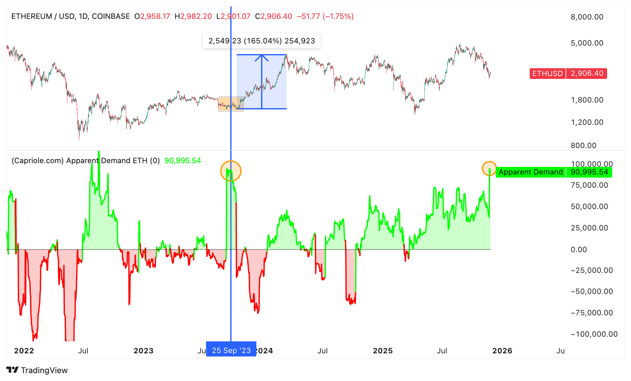 طبق دادههای شرکت کپریول اینوستمنت (Capriole Investment)، تقاضای ظاهری اتریوم که در ۲۲ نوامبر (۱ آذر) معادل حدود ۳۷,۰۰۰ ETH بود، چهار روز بعد به بیش از ۹۰,۰۰۰ ETH افزایش یافته است. این جهش در دورهای رخ داد که قیمت در حال اصلاح بود و این موضوع از انباشت تهاجمی سرمایهگذاران در کفهای قیمتی حکایت دارد.