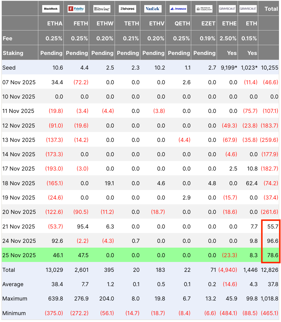 در کنار این دادهها، جریان ورودی ETFهای اسپات اتریوم نیز دوباره مثبت شده است. این صندوقها در سه روز متوالی مجموعاً ۲۳۰.۹ میلیون دلار ورودی ثبت کردهاند؛ چرخشی مهم پس از دورهای سنگین از خروج سرمایه میان ۱۱ تا ۲۰ نوامبر (۲۰ تا ۲۹ آبان)، که بیش از ۱.۲۸ میلیارد دلار از صندوقها خارج کرد. بخش مهمی از توان اتریوم برای حفظ حمایت ۲,۸۰۰ دلاری، از همین چرخش تقاضا و بازگشت سرمایه نهادی نشات میگیرد.