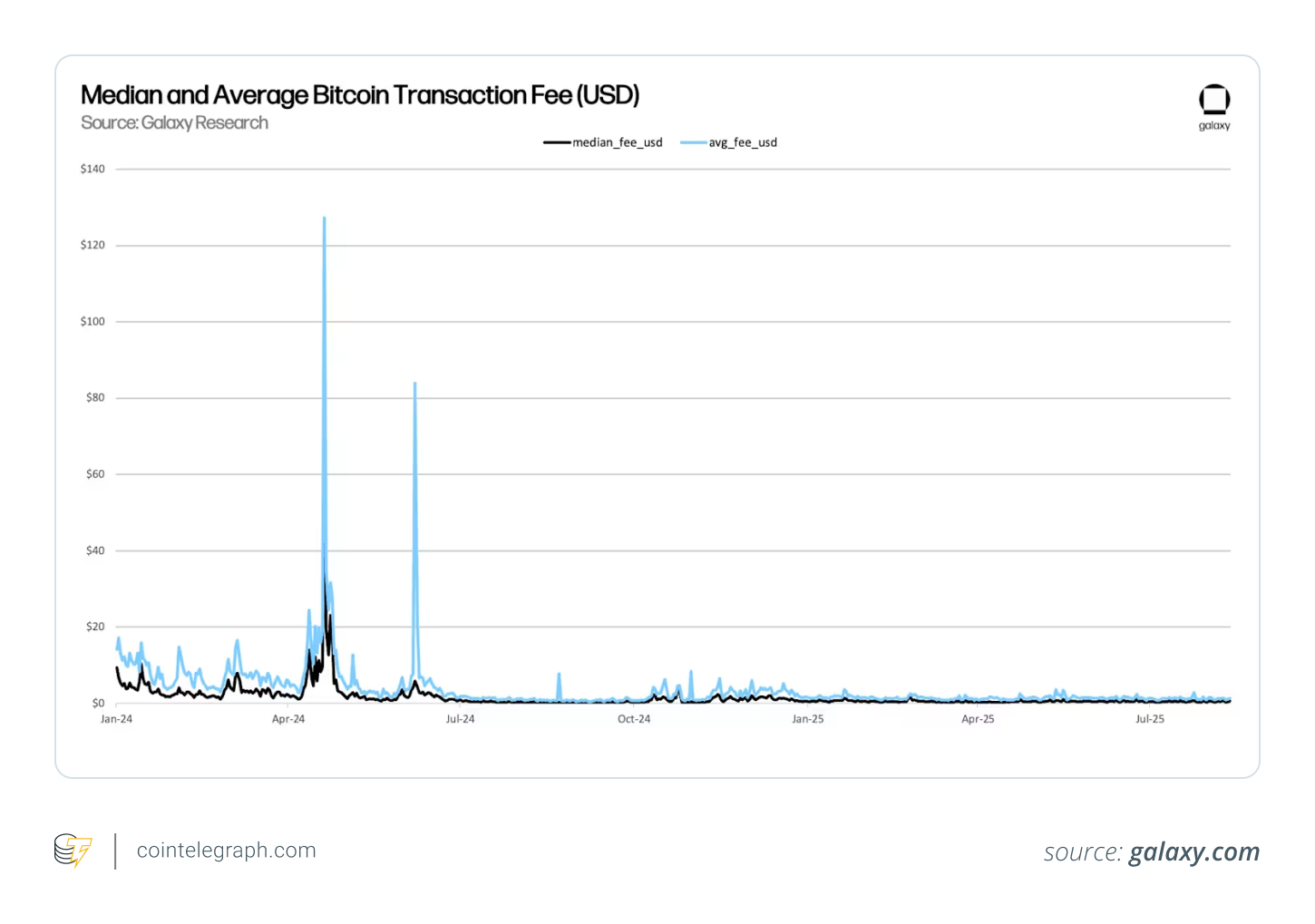 مقایسه کارمزد میانه و میانگین تراکنش‌های بیت کوین – منبع: galaxi.com