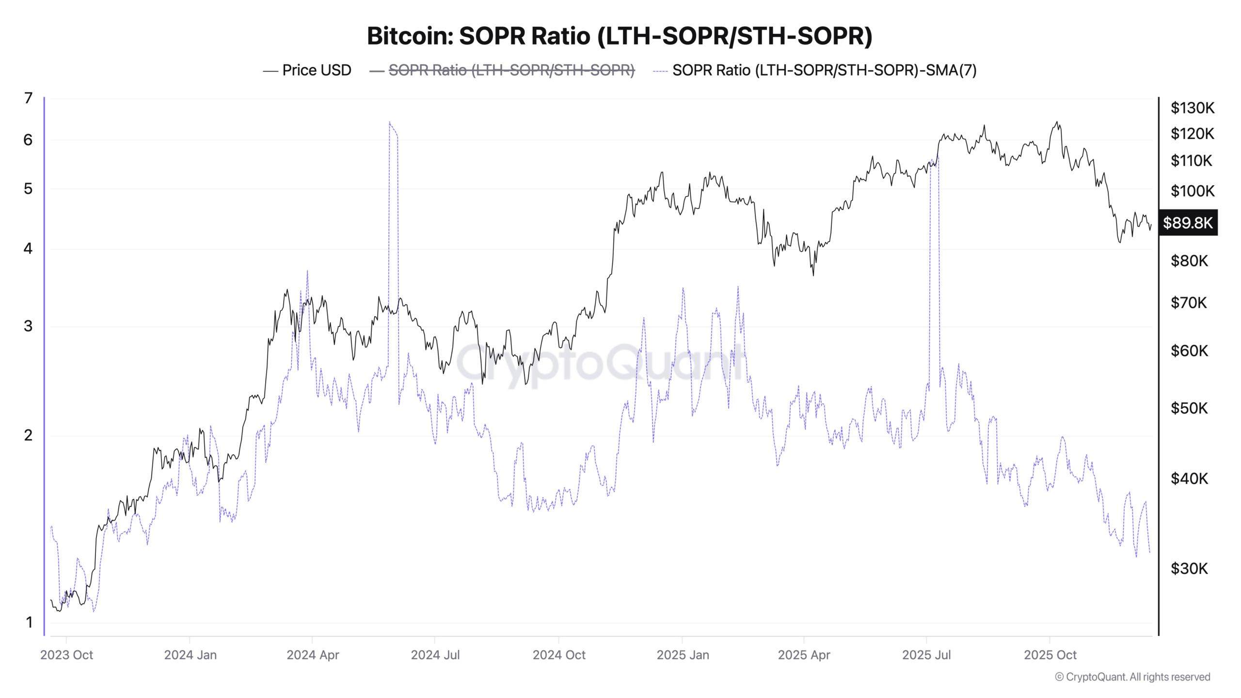 این دادهها بر اساس شاخص نسبت سود خروجی خرجشده یا همان SOPR بهدست آمدهاند؛ معیاری که نشان میدهد کوینهایی که در شبکه جابهجا میشوند، با سود فروخته شدهاند یا با ضرر. وقتی زیانهای ثبتشده توسط هولدرهای کوتاهمدت بهمراتب بیشتر از هولدرهای بلندمدت میشود، معمولاً میتوان آن را نشانهای از خروج سرمایهگذاران هیجانی و پاکسازی بازار تلقی کرد.