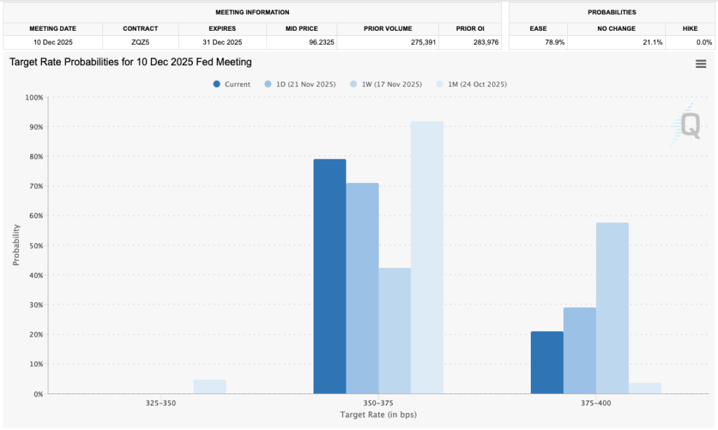 با این حال، تازهترین دادههای ابزار فدواچ (FedWatch) متعلق به گروه CME نشان میدهد که احتمال کاهش ۰.۲۵٪ نرخ بهره در جلسه ماه دسامبر اکنون حدود ۷۹٪ ارزیابی میشود؛ درحالیکه این رقم تنها یک هفته پیش حدود ۴۲٪ بود. این تغییر ناگهانی انتظارات، توجه اقتصاددانان را به خود جلب کرد.