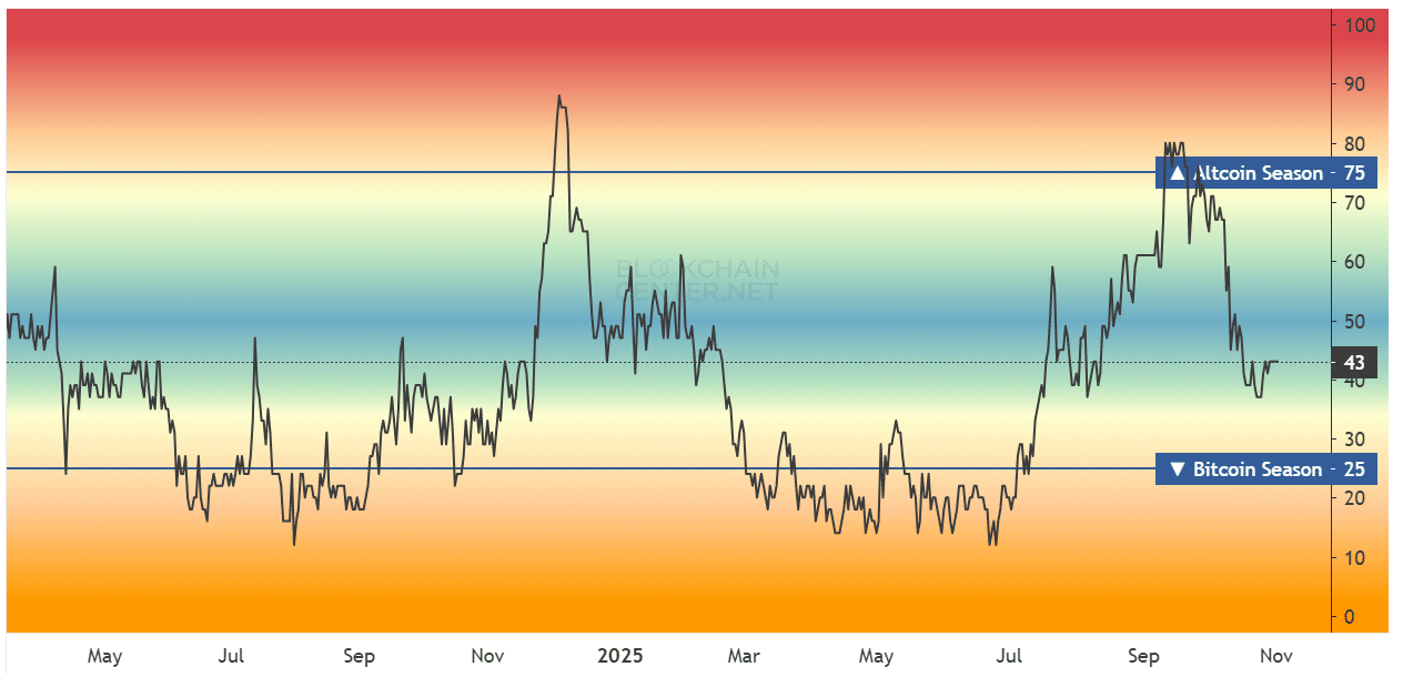 نخستین نشانههای ضعف بازار از نیمه اول سال ۲۰۲۵ آشکار شد. شاخص آلت سیزن که اواخر سال ۲۰۲۴ و پس از انتخابات آمریکا به بالای ۹۰٪ رسیده بود، در پی تشدید جنگهای تعرفهای میان ایالات متحده و چین، حدود ۱۰٪ کاهش یافت. در نتیجه، تقریباً تمام دستاوردهای جهش اواخر سال ۲۰۲۴ از بین رفت و بازار دوباره وارد فاز رکود شد.