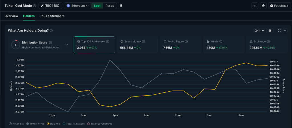 در همین حال، مگا نهنگها (صد آدرس بزرگ برتر) نیز داراییشان را ۰.۰۷٪ افزایش داده و اکنون ۲.۹۸ میلیارد توکن در اختیار دارند. در مجموع، نهنگها و مگا نهنگها طی یک روز نزدیک به ۲.۹۷ میلیون توکن بایو، به ارزش حدود ۲۲۶,۰۰۰ دلار، انباشت کردهاند.