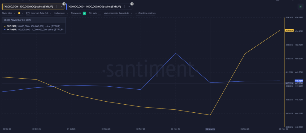 سومین توکنی که نهنگها در روزهای پس از سقوط خریداری کردهاند، سیروپ (Syrup) است؛ این رمزارز متعلق به پلتفرم دیفای میپل فایننس (Maple Finance) است که خدمات استیکینگ و وامدهی ارائه میدهد. دادههای آنچین نشان میدهد از ۴ نوامبر (۱۳ آبان)، یعنی درست پس از سقوط گسترده بازار، حجم انباشت نهنگها در سیروپ بهطور قابلتوجهی افزایش یافته است.