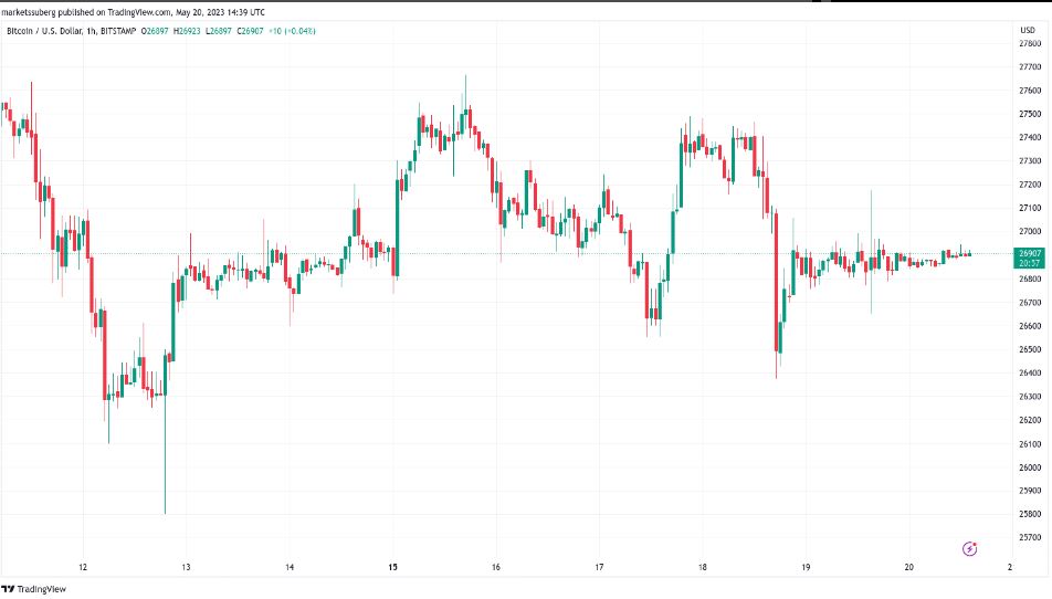به گزارش کوین تلگراف، قیمت بیت کوین تا ۲۰ مه (۳۰ اردیبهشت) در یک دامنه معاملاتی باریک حوالی ۲۷٬۰۰۰ دلار در نوسان بوده و این در حالیست که بازار به تازگی از محرکهای کلان در ایالات متحده خلاص شده است.