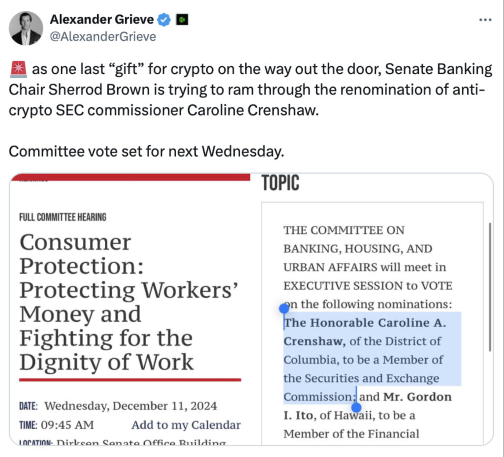 کمیته بانکداری سنای ایالات متحده، در تاریخ ۱۱ دسامبر (۲۱ آذر)، درباره تمدید دوره خدمت کارولین کرنشاو (Caroline Crenshaw)، کمیسیونر فعلی کمیسیون بورس و اوراق بهادار (SEC)، یکی از منتقدان سرسخت حوزه کریپتو، رأیگیری خواهد کرد.