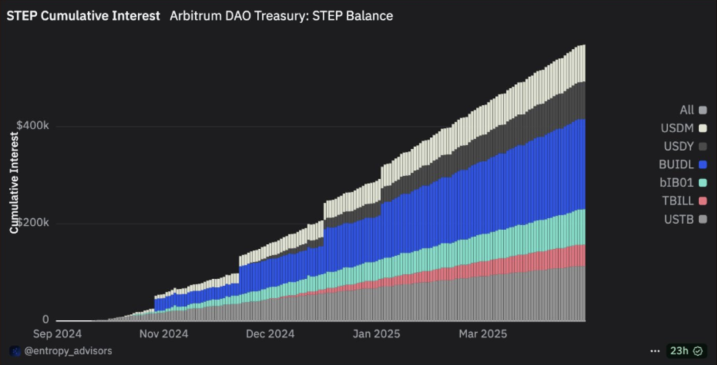 این رشد نمایی تا حد زیادی به برنامه سرمایهگذاری خزانهداری پایدار آربیتروم (STEP) نسبت داده میشود؛ برنامهای که اکنون در فاز دوم خود قرار دارد. در این طرح، ۸۵ میلیون توکن ARB برای پشتیبانی از داراییهای دنیای واقعی که پایدار، نقدشونده و سودده هستند، اختصاص داده شده است.