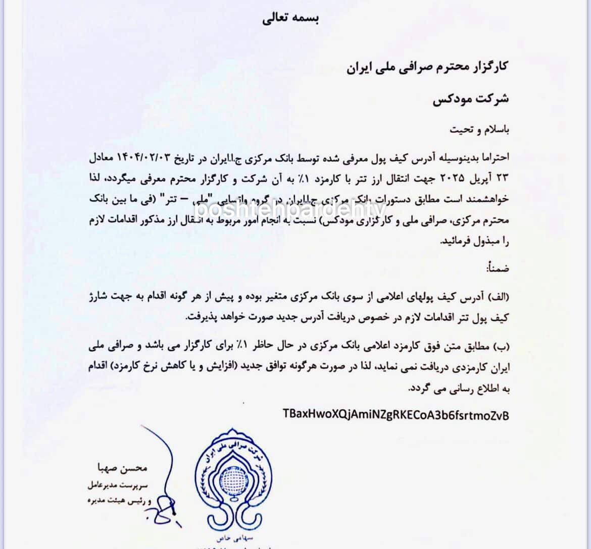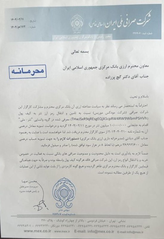 وی در ادامه درخواست کرده که به طور جدی بررسی شود که «آدرسهای کیف پول های مشتریان و سایر صرافیها که توقیف شده با چه مکانیزم و از چه مسیری از معاونت ارزی بانک مرکزی و واحد انفورماتیک خارج شده و در اختیار رسانهها و شبکههای معاند و اسراییل قرار گرفته است.»