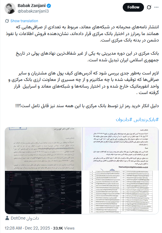 علیرغم تکذیب خبر خرید تتر توسط بانک مرکزی، بابک زنجانی در توییت جدید خود با انتشار تصاویری از نامههایی که آنها را «محرمانه» توصیف کرده، مدعی شده است این اسناد مربوط به تعدادی از صرافیهایی است که مشابه مجموعه او، در مقاطعی رمزارز تتر را در اختیار بانک مرکزی قرار دادهاند. به گفته زنجانی، انتشار این نامهها در رسانهها و شبکههای معاند، نشاندهنده وجود فروش اطلاعات یا نفوذ در بدنه بانک مرکزی، بهویژه در معاونت ارزی و واحدهای مرتبط با زیرساختهای انفورماتیک است.