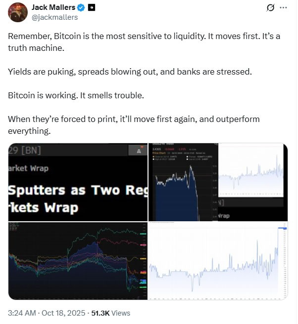 در حالیکه سهام بانکهای منطقهای مانند زایونز (Zions) و وسترن الاینس (Western Alliance) در روزهای اخیر بهشدت سقوط کردهاند و بیت کوین نیز تا پایینترین سطح چهارماهه خود افت کرده است، بازارها بوی بحران تازهای را حس میکنند. مالرز میگوید این اتفاقات تصادفی نیستند؛ بلکه نشانهای هستند از نزدیک شدن ایالات متحده به بحران نقدینگی دیگری که تنها با چاپ پول میتوان از آن گریخت، همان اتفاقی که در سال ۲۰۲۳ نیز رخ داد.