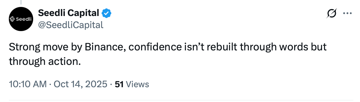 با وجود حجم بالای این بسته جبرانی، واکنش کاربران در شبکه اجتماعی X دوقطبی بوده است. برخی مانند سیدلیکپیتال (SeedliCapital)، از بایننس بابت تلاش برای بازسازی اعتماد در شرایط بحرانی تمجید کردهاند.