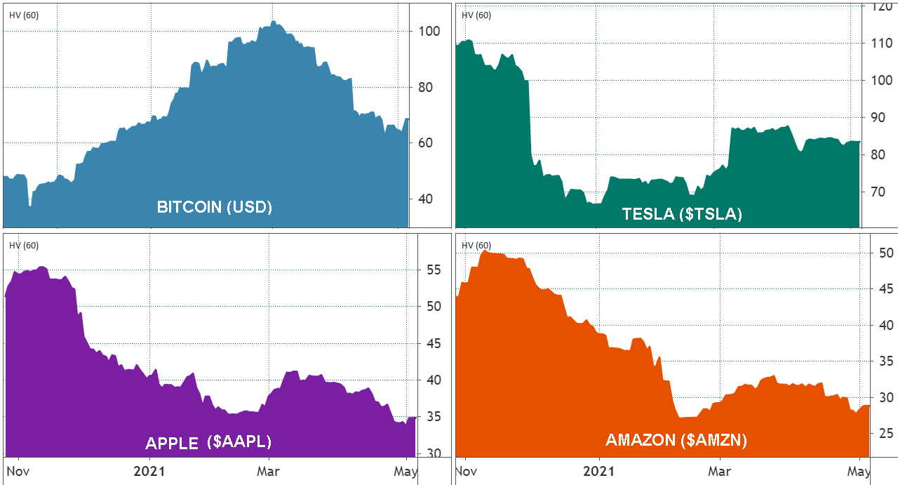 اولین نکته‌ای که می‌توان از نمودار فوق متوجه شد این است که سطح نوسان بیت کوین و سهام تسلا در مقایسه با سطح نوسان سهام شرکت‌های چند تریلیون دلاری نظیر اپل و آمازون متفاوت است.