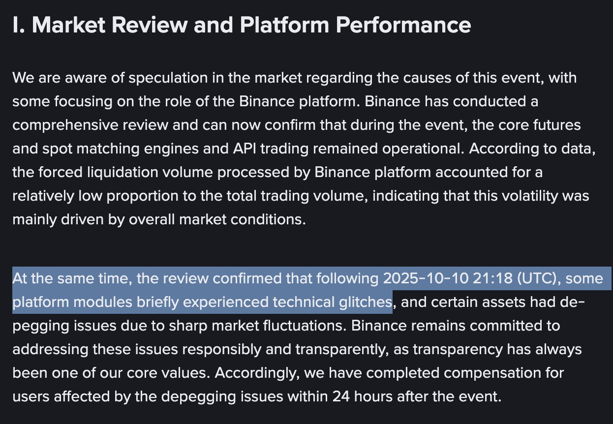 علیرغم گستردگی فاجعه (شامل دهها میلیارد دلار تبخیر و ضررهای چند میلیارد دلاری بازارسازان)، واکنش بایننس مبهم و ناکافی بود. پاسخ رسمی بهیک نقص موقت در برخی از ماژولهای معاملاتی (a temporary glitch in some trading modules) اشاره داشت، توضیحی که به هیچ وجه ابعاد این فروپاشی سیستمیک را توجیه نمیکند.