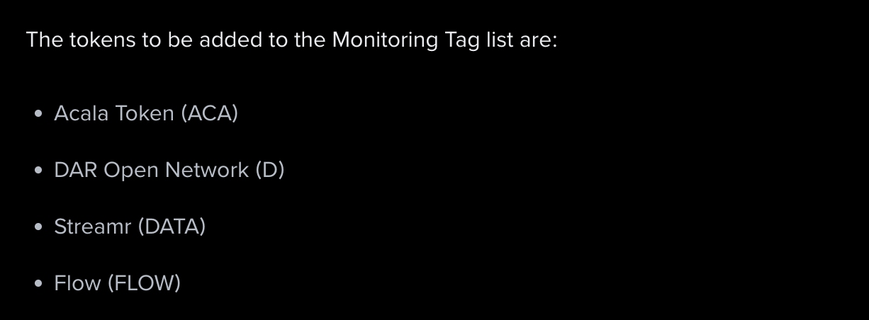 بایننس تأکید کرد که توکنهایی با این برچسب، در معرض خطر جدی خروج کامل از فهرست معاملات قرار دارند؛ زیرا ممکن است در ادامه، دیگر معیارهای لازم برای باقی ماندن در لیست صرافی را نداشته باشند. با این حال، این صرافی تنها به «بررسیهای اخیر» اشاره کرده و بهصورت رسمی نامی از هک شبکه فلو نبرده است.