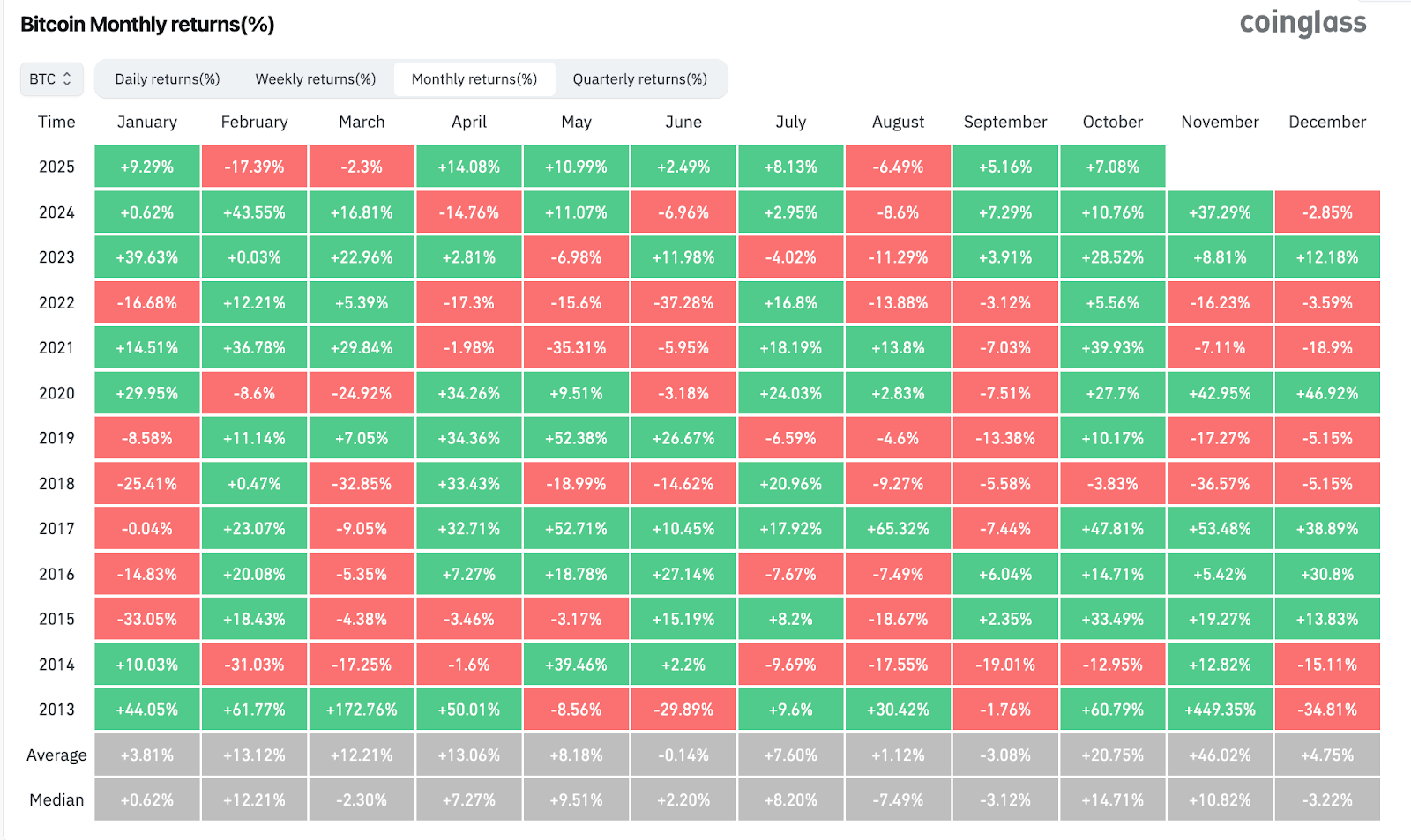 بر اساس داده‌های «کوین‌گلس (CoinGlass)»، ماه اکتبر از سال ۲۰۱۳ تاکنون به طور میانگین دومین ماه پربازده بیت کوین بوده و معمولاً رشد ۲۰٫۷۵٪ را به همراه داشته است.