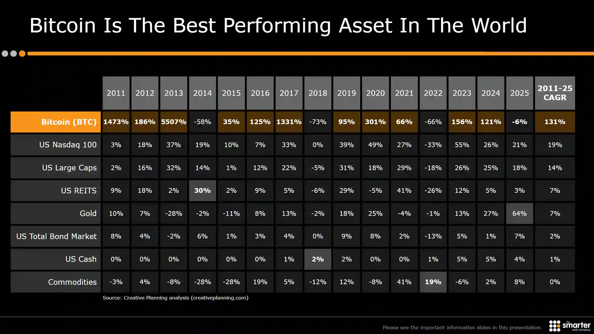به‌گفته جسی مایرز (Jesse Myers)، مدیر استراتژی بیت کوین در شرکت Smarter Web Company، بیت کوین همواره پس از کلوز سالانه منفی، تمایل قابل‌توجهی به بازیابی و رشد قوی داشته است. داده‌های دهه گذشته چهار سال منفی (۲۰۱۴، ۲۰۱۸، ۲۰۲۲ و اخیراً ۲۰۲۵) را برجسته می‌کنند.