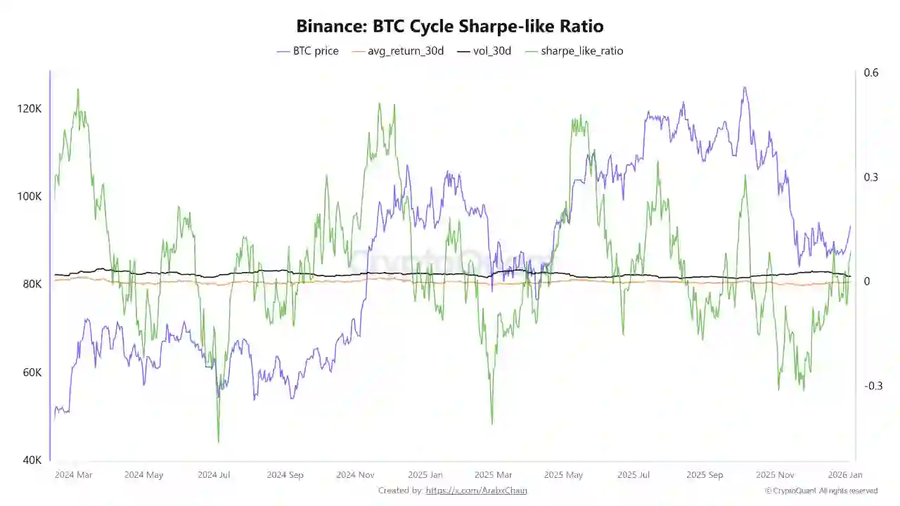 شاخص‌های کوتاه‌مدت نشان می‌دهند که همچنان ممکن است صبر بیشتری لازم باشد. داده‌های CryptoQuant نشان می‌دهد میانگین بازده ۳۰روزه بیت کوین در صرافی بایننس حدود ۰.۰۰۱۶ است که حاکی از مومنتوم ضعیف‌تر نسبت به فازهای پیشین است. در عین حال، نوسان‌پذیری در سطح نسبتاً بالای ۰.۰۱۸ باقی مانده که بیانگر حساسیت مداوم قیمت به حرکات کوتاه‌مدت است.