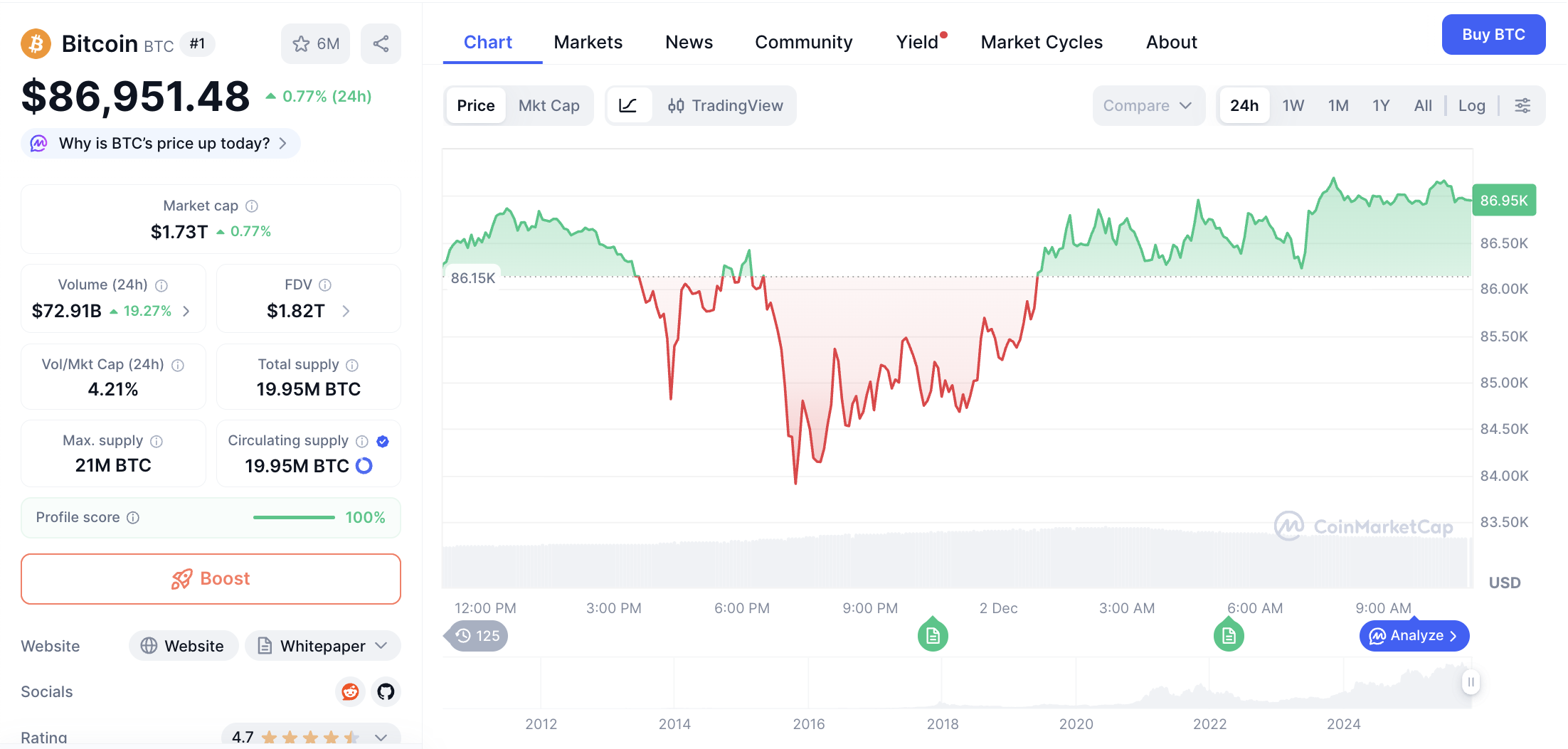 در زمان نگارش این مطلب، بیت کوین کمی بهبود روزانه داشته است و در نزدیکی ۸۷,۰۰۰ دلار معامله میشود؛ اما فضای تحلیلها نشان میدهد که بازار همچنان بین امید و نگرانی معلق مانده و هر دو سناریو هنوز روی میز هستند.