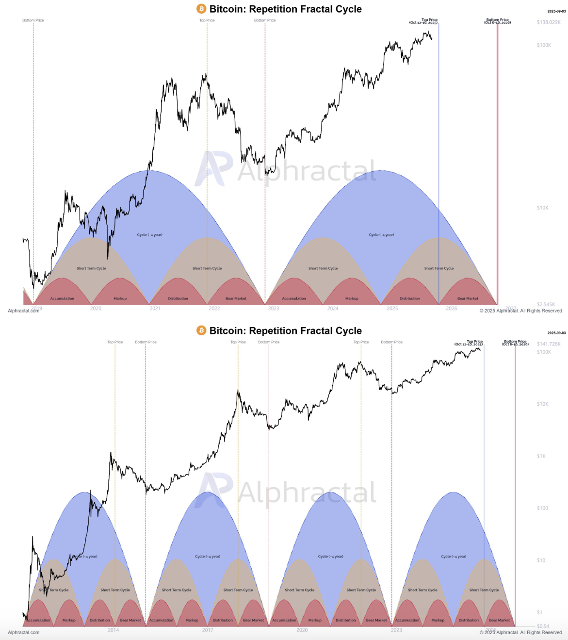 در میانه تردیدها درباره آینده، ودسون احتمال آغاز یک بازار نزولی جدید از ماه اکتبر را مطرح کرده است. او با انتشار نمودارهایی از الگوی موسوم به چرخه فرکتال تکراری (Repetition Fractal Cycle) در شبکه X نشان داد که قیمت بیت کوین به نقطهای نزدیک میشود که در گذشته آغازگر بازارهای نزولی بوده است.