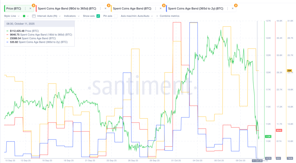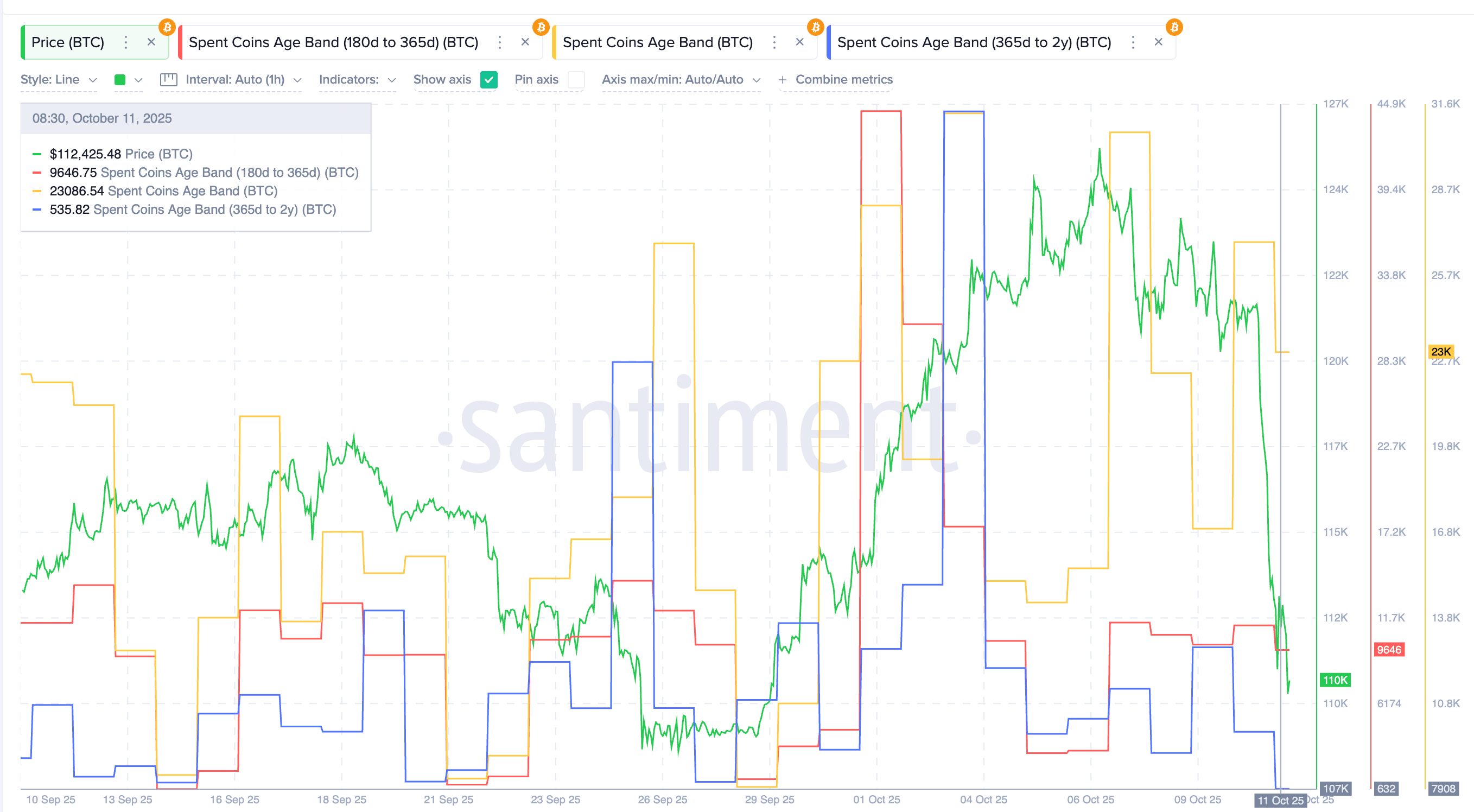 داده‌های شاخص باند سن کوین‌های خرج‌شده (Spent Coins Age Bands یا SCAB) نیز همین روند را تأیید می‌کند. این شاخص بررسی می‌کند که چه گروهی از هولدرها در حال خرج کردن BTC خود هستند. در زمان آغاز سقوط در ۱۰ اکتبر (۱۸ مهر)، میزان کل SCAB حدود ۱۷٬۱۰۰ بیت کوین بود؛ در این میان، باند ۱۸۰ تا ۳۶۵ روزه (رنگ قرمز) حدود ۹٬۹۹۵ BTC و باند یک تا دو ساله (رنگ آبی) حدود ۲٬۴۵۲ بیت کوین را شامل می‌شد.
