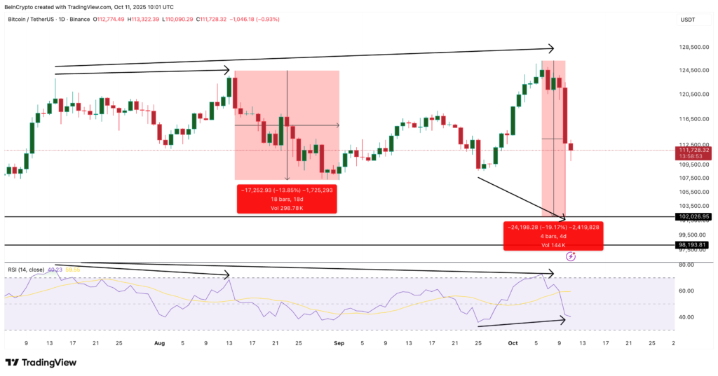 در بازه‌ی میان جولای تا اوایل اکتبر، بیت کوین دقیقاً همین الگو را تجربه کرد: قیمت سقف‌های بالاتری زد، اما RSI روند نزولی گرفت. نتیجه، اصلاحی تند و ۱۹.۱٪ بود که از نظر شدت تقریباً مشابه افت ۱۴٪ قبلی ناشی از واگرایی مشابه بود. این شباهت‌ها بار دیگر اهمیت سیگنال‌های RSI در حرکات قیمتی بیت کوین را یادآوری می‌کند.