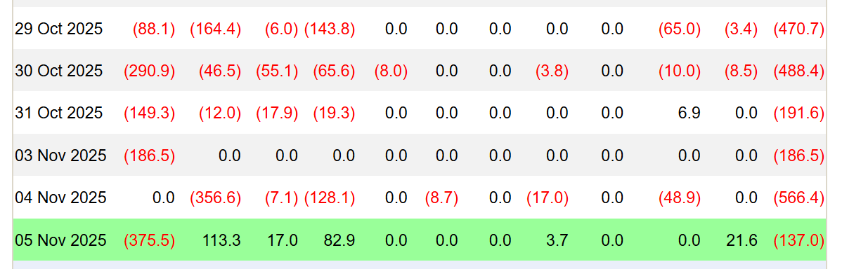 این روند که از ۲۹ اکتبر آغاز شد، تاکنون بیش از ۲.۰۴ میلیارد دلار خروج سرمایه را رقم زده است. سنگینترین روز خروج سرمایه سهشنبه اتفاق افتاد که طی آن سرمایهگذاران ۵۶۶ میلیون دلار برداشت کردند. این رقم پس از خروج ۴۷۰ میلیون دلار، ۴۸۸ میلیون دلار و ۱۹۱ میلیون دلار در روزهای پیشین ثبت شده بود.