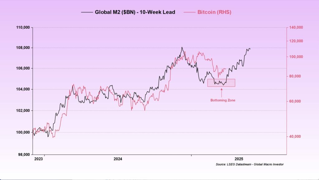 این متخصص اقتصاد کلان و بازارهای مالی جهانی، نموداری را به اشتراک گذاشت که نشان میدهد M2 جهانی یا کل عرضه پول در سراسر جهان، پس از ثبت کف قیمت در اواخر سال ۲۰۲۴ به شدت افزایش یافته است. بر اساس دادهها، پال پیشبینی میکند که قیمت بیت کوین بهزودی به اصلاح خود پایان میدهد و شروع به افزایش خواهد کرد: