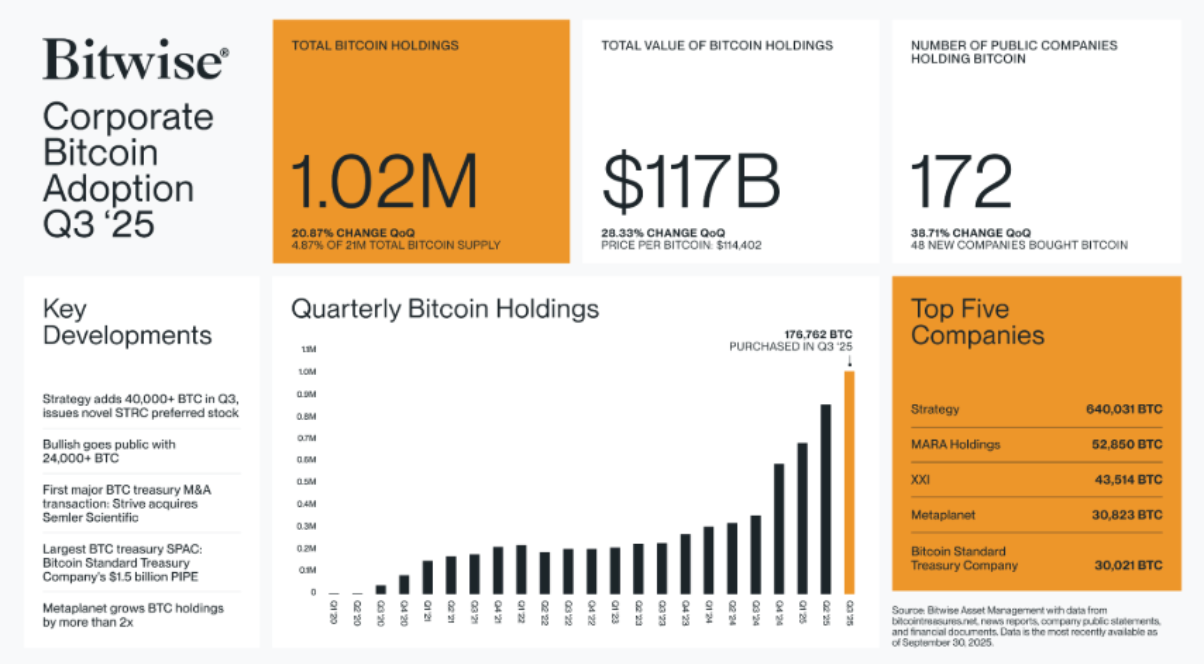در گزارش سهماهه سوم شرکت بیتوایز (Bitwise) با عنوان «گزارش پذیرش سازمانی بیت کوین»، آمده است که در حال حاضر ۱۷۲ شرکت دارای ذخایر بیت کوین هستند و از این میان، ۴۸ شرکت در سهماهه اخیر به این فهرست اضافه شدهاند. ارزش کل بیت کوینهای ترازنامه این شرکتها نیز نسبت به فصل قبل ۲۸٪ رشد کرده و به ۱۱۷ میلیارد دلار رسیده است.