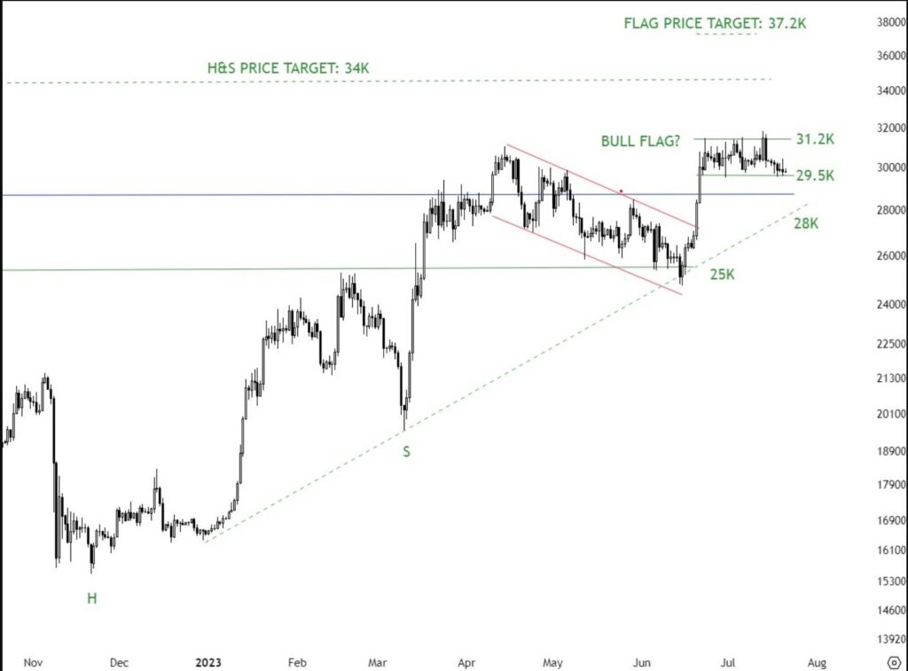 الگوی پرچم صعودی نیز یک الگوی ادامهدهنده است که هدف قیمت به اندازه میله پرچم خواهد بود. در حال حاضر حرکت یک ماه اخیر بیت کوین را میتوانیم یک الگوی پرچم صعودی فرض کنیم که در این صورت میله پرچم به اندازه ۶,۲۰۰ دلار (فاصله ۳۱,۲۰۰ تا ۲۵,۰۰۰ دلار) خواهد بود. بنابراین هدف قیمتی این الگو معادل ۳۷٬۲۰۰ دلار است.