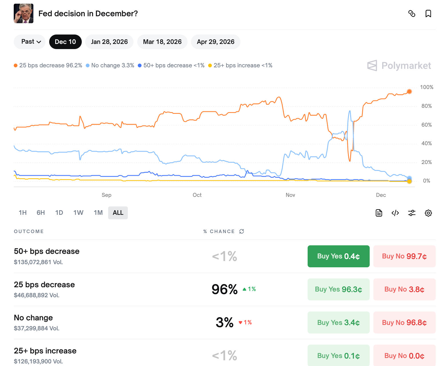 دادههای پلتفرم پالیمارکت (Polymarket) احتمال این کاهش را حدود ۹۶.۸٪ ارزیابی میکند، در حالی که تنها ۳٪ احتمال میدهند نرخ بهره بدون تغییر باقی بماند. با این حال، تحلیلگران معتقدند بخش زیادی از اثر این کاهش احتمالی، پیشاپیش در قیمتها منعکس شده است.