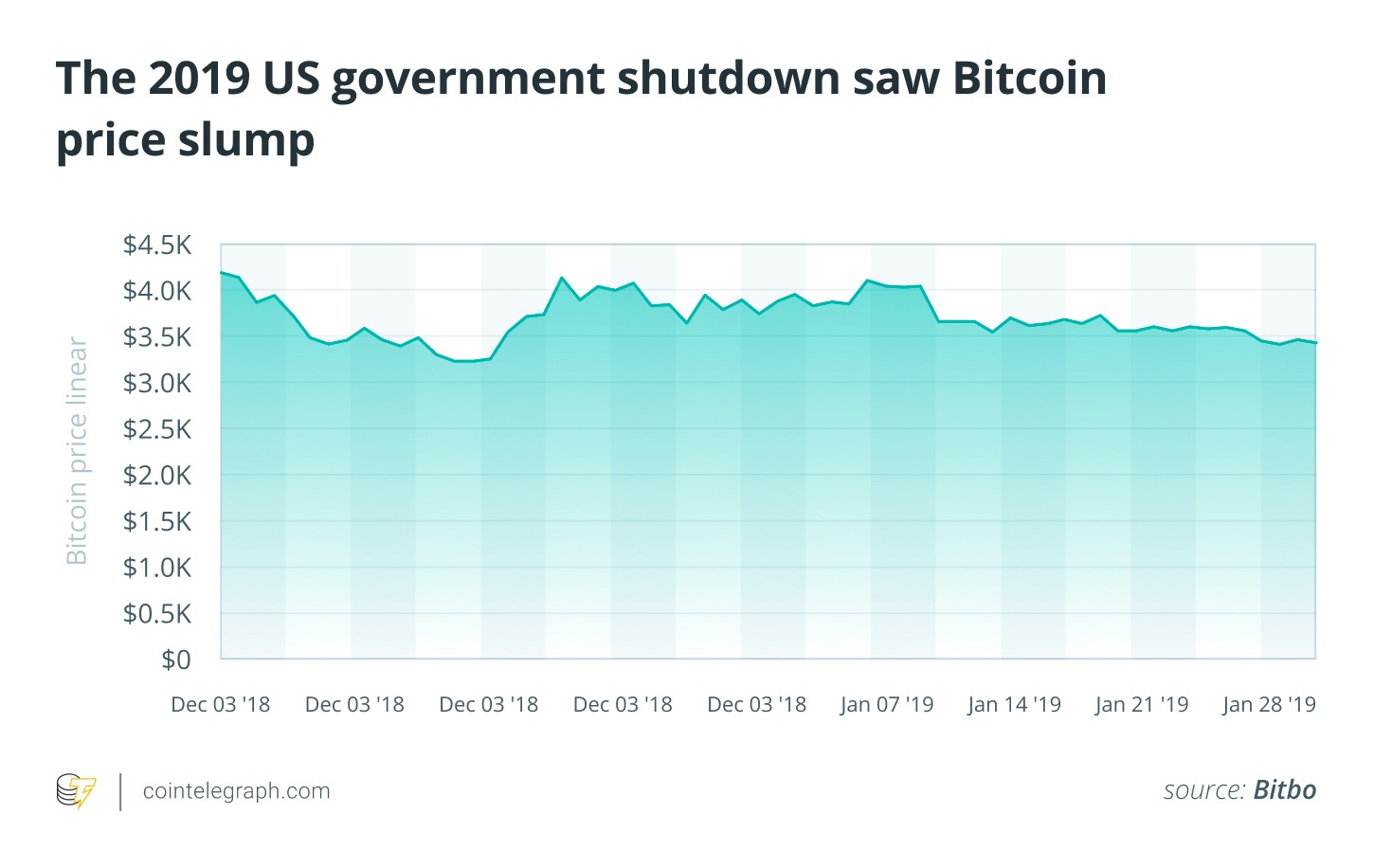 در جریان همان بحران سال ۲۰۱۹، بیت کوین ابتدا حدود ۱۶٪ افت کرد و از ۴,۲۰۰ دلار به حدود ۳,۵۰۰ دلار رسید؛ اما پس از بازگشایی دولت، روندی صعودی در پیش گرفت و تنها در پنج ماه، حدود ۳۰۰٪ رشد داشت و تا محدوده ۱۳,۰۰۰ دلار جهش کرد.