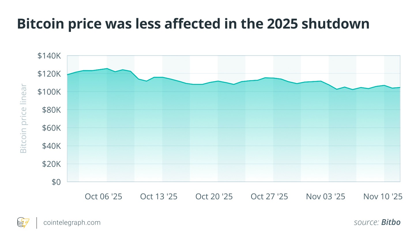 اکنون، تقریباً هفت سال بعد، بیت کوین دوباره در حال دست و پنجه نرم کردن با چالشهای ناشی از تعطیلی دولت است؛ هرچند اینبار شدت این افت کمتر است. قیمت بیت کوین از حدود ۱۲۰,۰۰۰ دلار در آغاز بحران، با حدود ۱۲٪ افت به نزدیکی ۱۰۵,۰۰۰ دلار رسید.