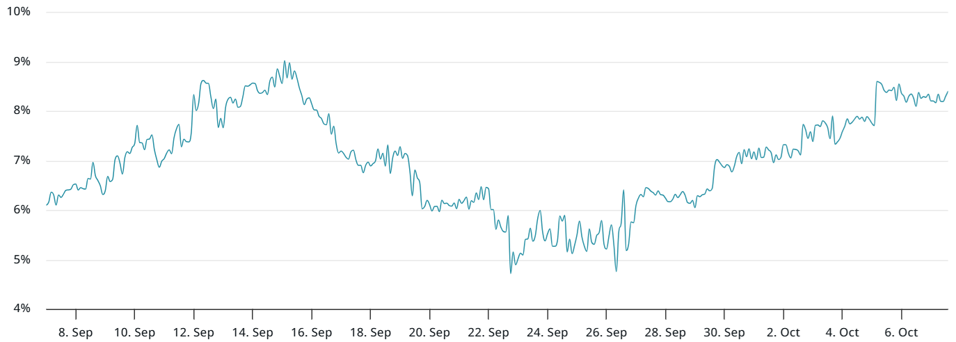 دادههای بازار مشتقات نشان میدهد قراردادهای آتی ماهانه بیت کوین در حال حاضر با ۸٪ پریمیوم سالانه نسبت به بازار اسپات معامله میشوند.