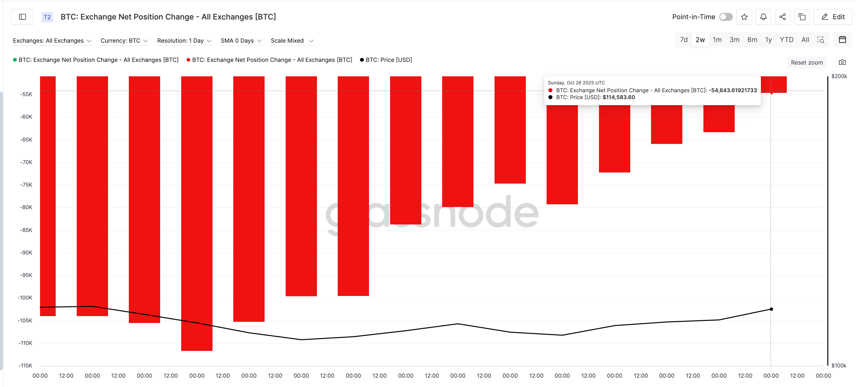 در تاریخ ۱۵ اکتبر (۲۳ مهر)، میزان خروج بیت کوین از صرافیها به سطح قابلتوجه ۱۱۱٬۷۲۰ BTC رسید که نشاندهنده قدرت فشار خرید بود. اما تا ۲۶ اکتبر (۴ آبان)، این رقم به ۵۴٬۶۴۳ BTC کاهش یافت که معادل حدود ۵۱٪ افت است.