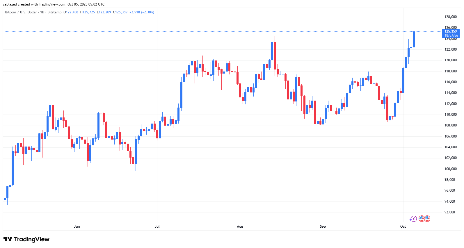قیمت بیتکوین در جریان جلسه معاملاتی آسیا در روز یکشنبه جهش کرد و ظرف چند دقیقه از ۱۲۲٬۰۰۰ دلار به ۱۲۵٬۰۰۰ دلار رسید و سقف جدید زد.