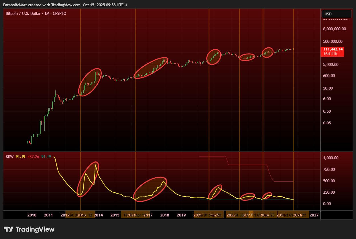 با این حال، تحلیلگران هشدار میدهند که ماه پیش رو میتواند همراه با نوسانات کمسابقه باشد. متیو هایلند (Matthew Hyland)، تحلیلگر بازار کریپتو، با اشاره به شاخص نوسان باندهای بولینگر (Bollinger Bands) اظهار داشت که این شاخص به «بیشترین حد فشردگی در تاریخ بیت کوین» رسیده است.