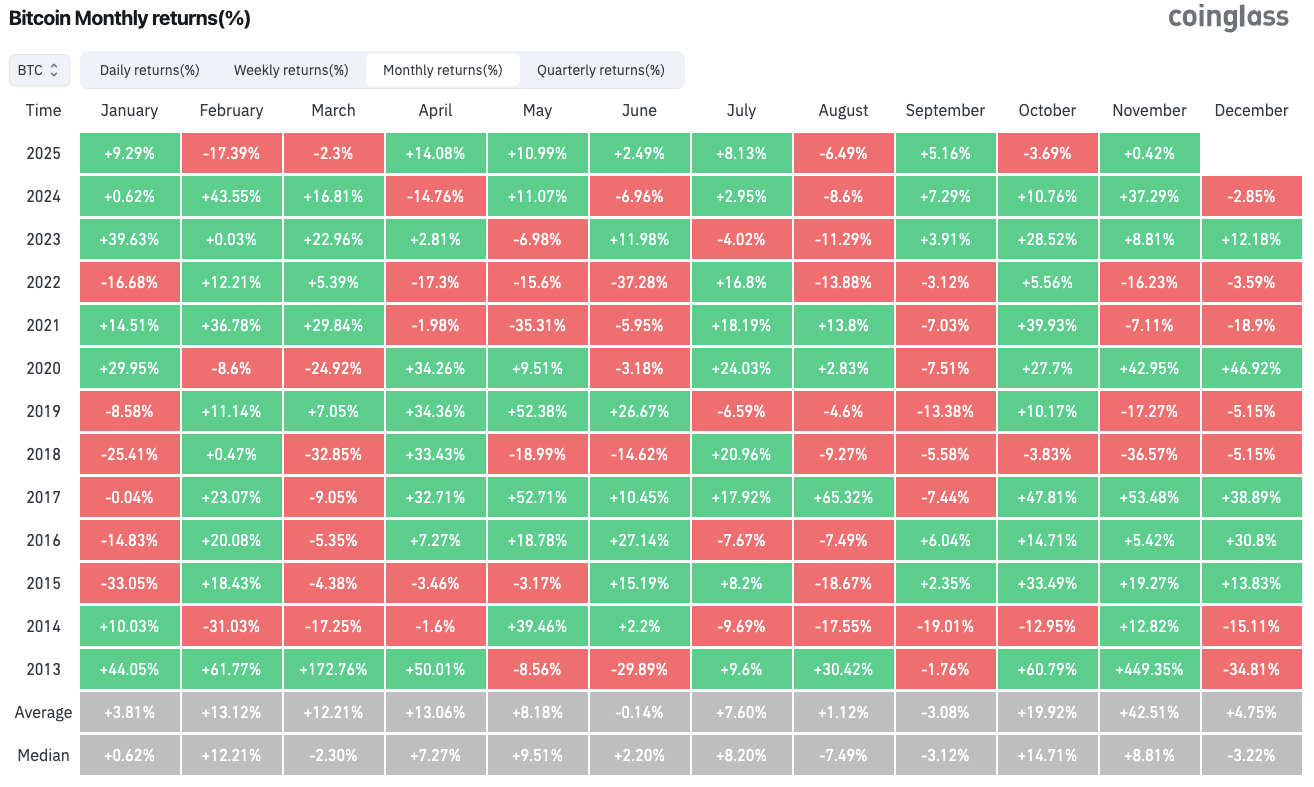 دادههای CoinGlass نشان میدهد که میانگین بازدهی بیت کوین در ماه نوامبر، از سال ۲۰۱۳ تاکنون حدود ۴۲.۵٪ بوده است.